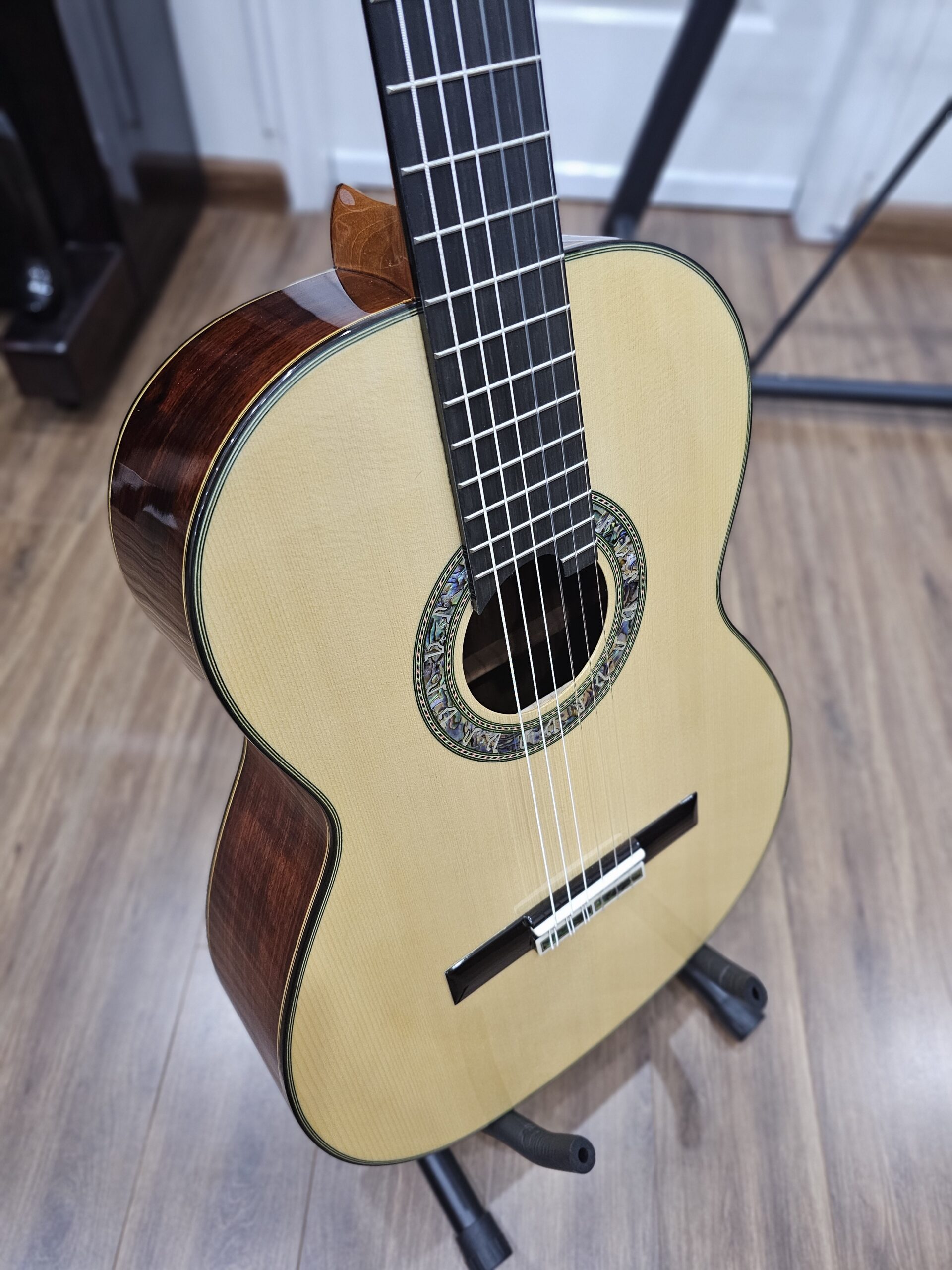 - Mặt top là gỗ European Spruce nguyên tấm – nổi tiếng với độ vang, độ nhạy cao, và sự cân bằng tự nhiên trong dải âm.