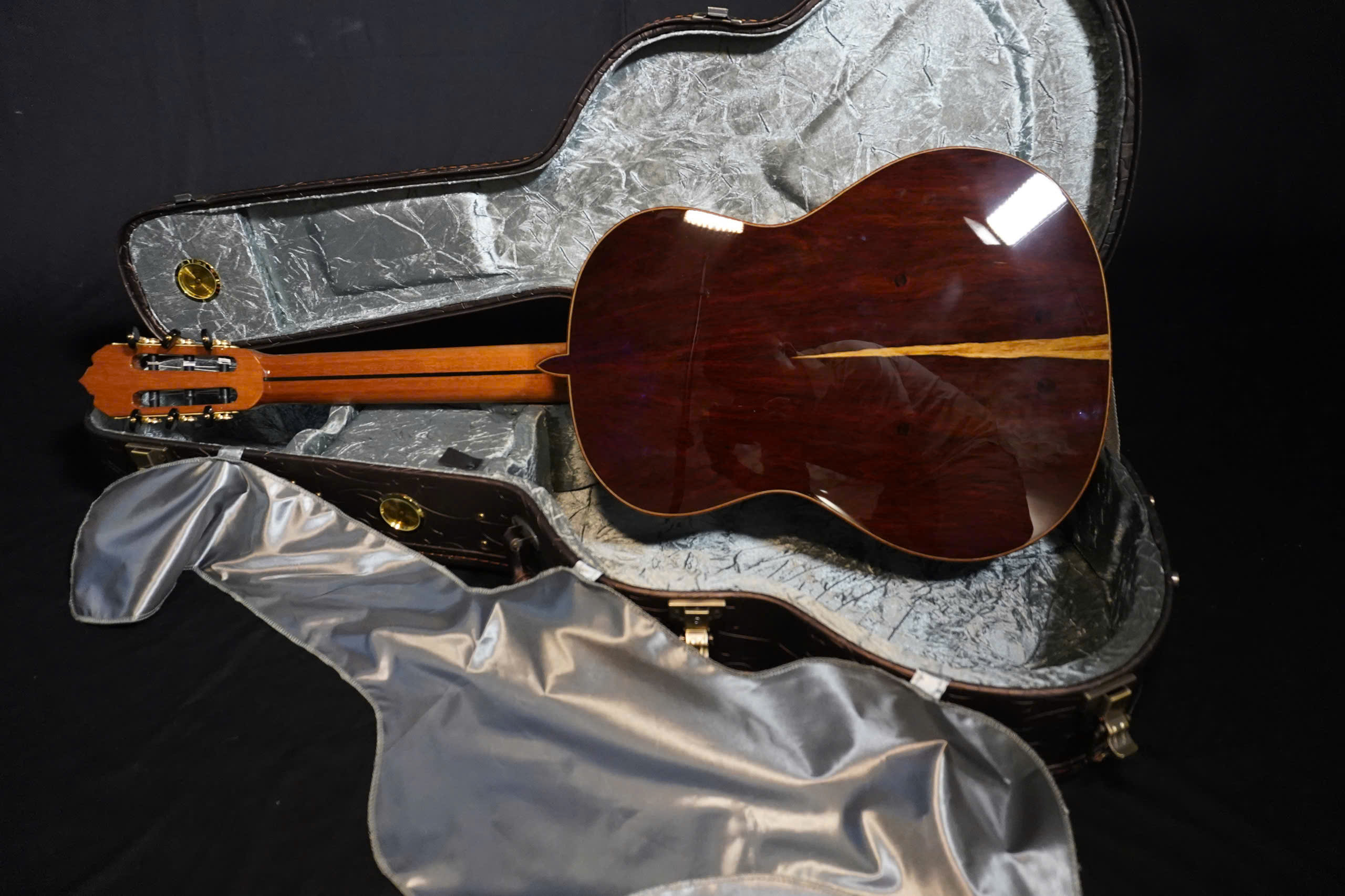 - Lưng hông làm từ gỗ Cocobolo nguyên tấm – loại gỗ quý hiếm có màu sắc rực rỡ, vân gỗ cuộn xoáy và âm thanh sâu, dày, ấm áp.